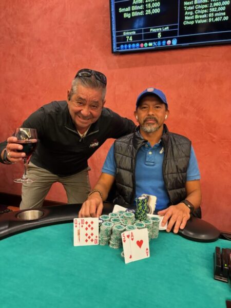 Pedro Palacio takes 1st place in in a 5-way chop in the Friday night tournament. Cheers to a fun night at the Coconut Creek Casino and a big congratulations to Pedro for his win tonight.