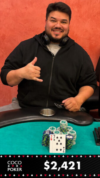 Pictured above Mr. Sanchez takes home 1st place, winning $2421 in the Wednesday 6pm 10K bounty tournament.